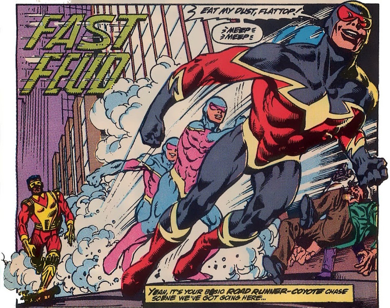It makes sense too. Rocket Racer and Speed Demon are both guys who go fast and they’re both the types who enjoy it and love showboating and stuff. They’re kinda similar, really. The difference is that Bob built all his tech himself and Speed Demon was just some chemist who was seemingly chosen at random by a cosmic entity to receive the ability to move at superhuman speeds. It feels right that Bob’s rival would be a capable but a little dumb guy who got his powers by chance and decided to be a dick with them.